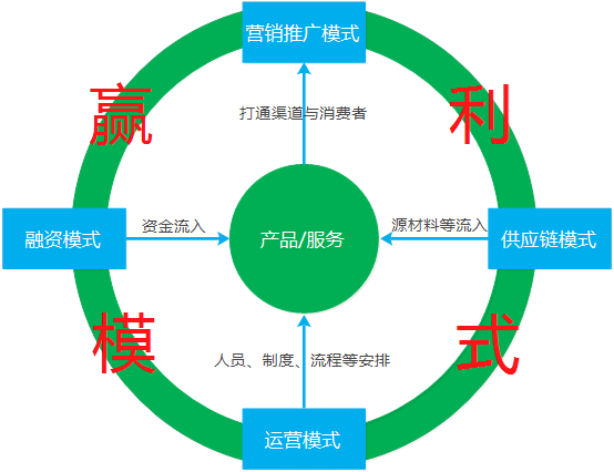 上述模式组成中,供应链模式、运营模式和营销推广模式保证了物流的畅通,运营模式保证了人流和信息流的畅通,融资模式和营销推广模式保证了资金流的畅通。物流、人流、信息流、资金流的畅通又进一步促进了企业的赢利模式的达成。