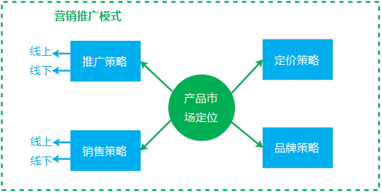 在设计营销推广模时其首先需要做的内容就是市场定位,如细分市场、市场的差异化设计等。在此基础上进行产品定价策略、推广策略(线上线下)、销售策略(含渠道策略)以及品牌策略的制定。如下图: