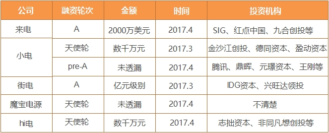 4月初左右,共享充电宝领头企业中街电科技也获得了IDG、欣旺达投资的亿元A轮融资;小电科技连续拿到了两轮总计过亿的融资;来电科技拿到了SIG、红点创投、九合创投两千万美元的融资。借共享概念,共享充电宝是继共享单车后又一波资本战(见下图)。