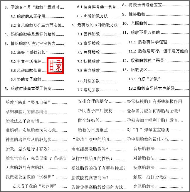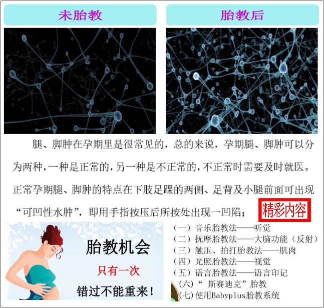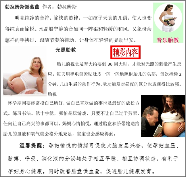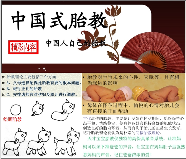 胎教 2021-10-19 胎教是设计宝宝高智商的有效方法,本系列学习资料从女性孕前准备、怀孕心理到胎教准备、理清对胎教的正确认识,还包括胎教的最佳时机、与胎儿沟通的方式、胎教方法、胎教训练、爸爸的重要作用与实践、胎教误区等让准妈妈准爸爸们能够正确胎教,此外,对于胎儿在各月发育特点进行了介绍,资料系统全面。