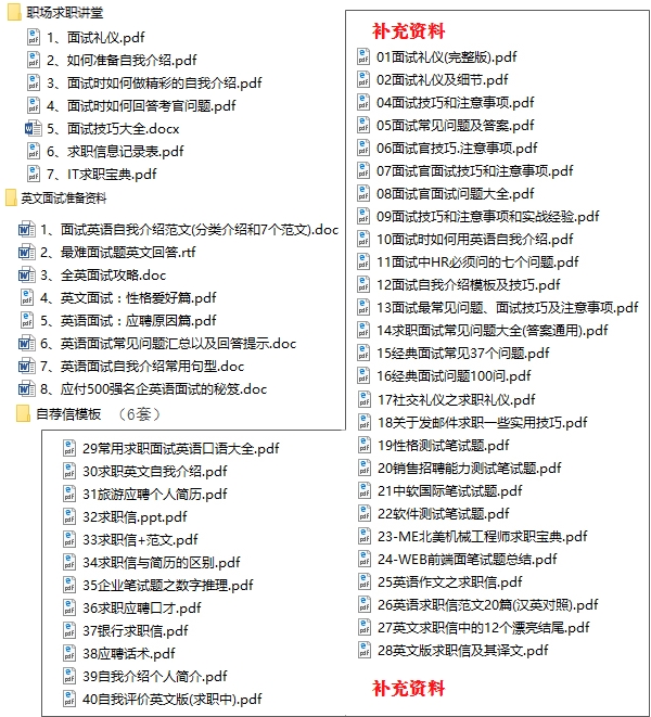 职场求职 2021-10-19 工作变换是职场人士提升自身价值的有效途径和方法,面试是一道绕不过的坎。本资料为职场人士提供求职系列咨询资料(简历撰写、面前准备、面试礼仪、自我介绍、回答考官问题、注意事项、面试技巧等)、简历模板(超过200套)、英文简历示范(超过20套)、自荐信示范案例、英文面试准备资料等。内容系统、丰富详实,是职场人士达成职业目标不可缺少的良师益友。
