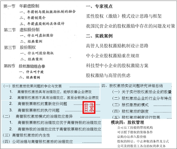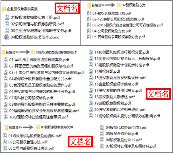 股权激励 2021-09-19 股权激励实提高企业核心员工工作积极性和工作效率的重要手段。本系列学习资料内容包括:企业股权激励手册(股权激励理论、模型、常见问题、常用模式、激励方案及具体实施)、企业股权激励研究(股权激励模式设计思路与框架、股权激励存在的问题与对策、企业高管人员股权激励机制设计思路、科技型中小企业股权激励方案等)、企业股权激励运用策略与实务(讲义)以及股权激励协议书范本(标准版)。