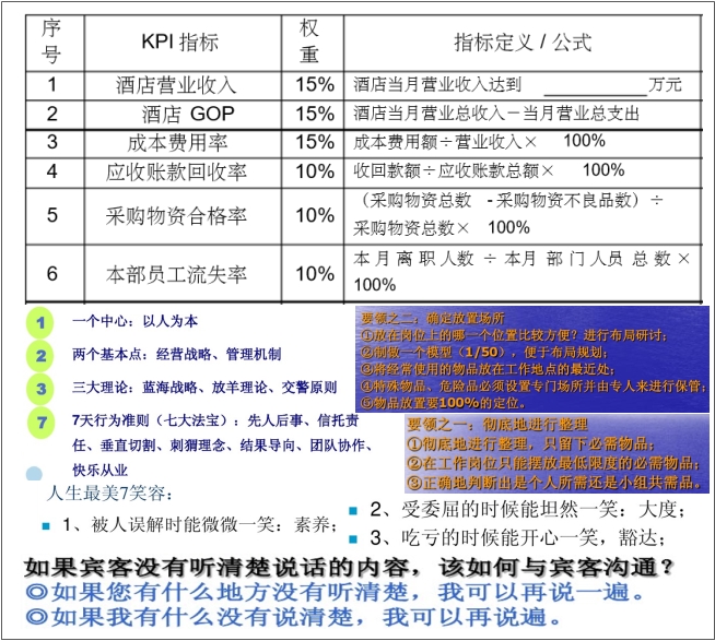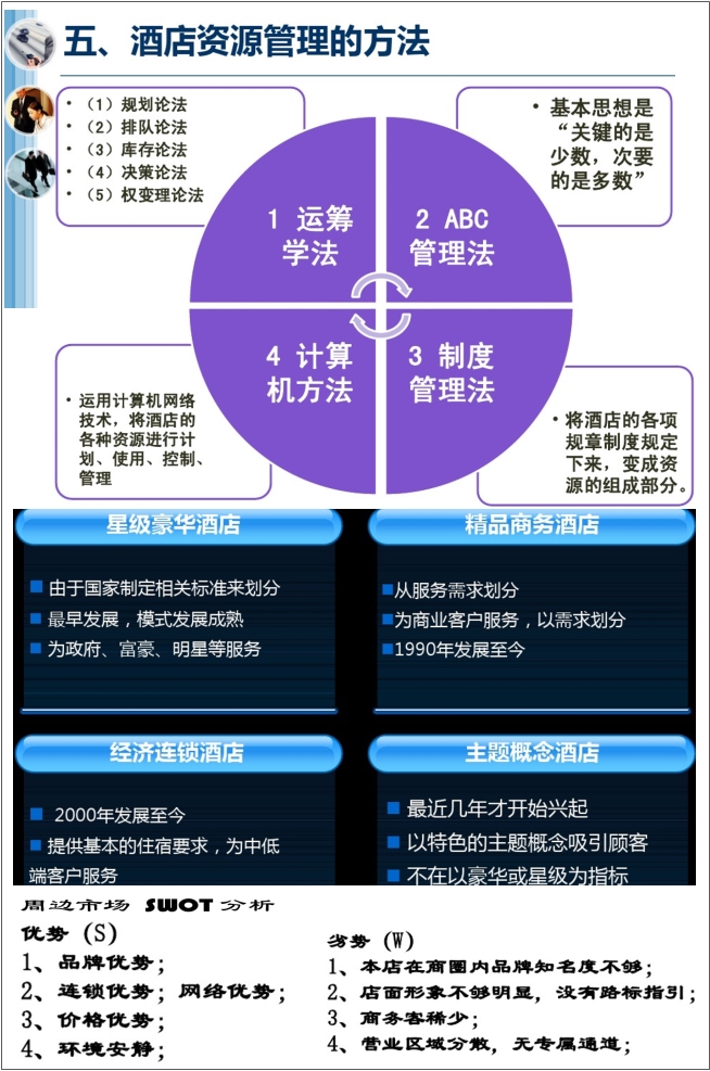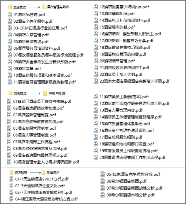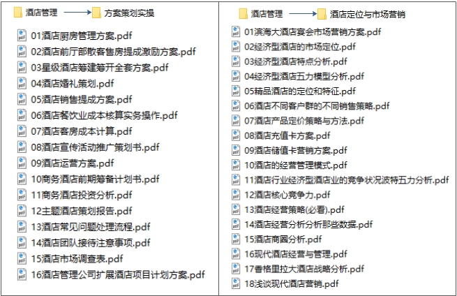 酒店管理与经营模式多种多样,营销手段也是千差万别,如何在现有基础上更进一步?本系列资料包括:酒店管理与培训资料(如酒店的基础知识、5s管理、从酒店的筹备、扩建到销售、以及员工的礼仪、细节等)、酒店定位与市场营销(如从酒店顶维护、竞争力以及5力分析、到经营数据分析、经营策略以及各类营销方案、方案策划与实操(如筹建方案、管理方案、到活动推广和市场营销方案以及各种处理流程等实操内容)、考核与制度(如各部门管理制度、绩效考核与薪酬管理等)以及品牌酒店如七天、希尔顿都管理经验等。