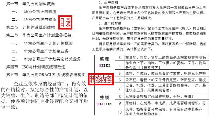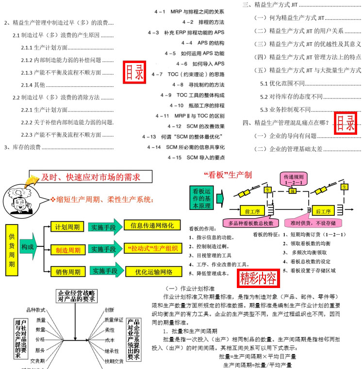 计划与生产管理 2021-09-19 当今,企业竞争的焦点越来越明显地集中在产品质量,生产成本,交货期,服务和新产品的开发速度上,而这些因素无不取决于生产管理的方式和效率。本系列资料包括:生产与管理模式、企业生产过程组织、生产计划与生产作业计划 、生产计划与物料控制、生产计划与交期管理、车间生产计划与制定流程、生产制度、精益生产管理八大浪费与解决方法、精益生产方式JIT、华为年内部生产计划手册以及某公司生产计划案例与5S推行计划指导书等内容。
