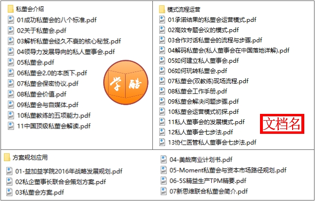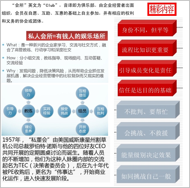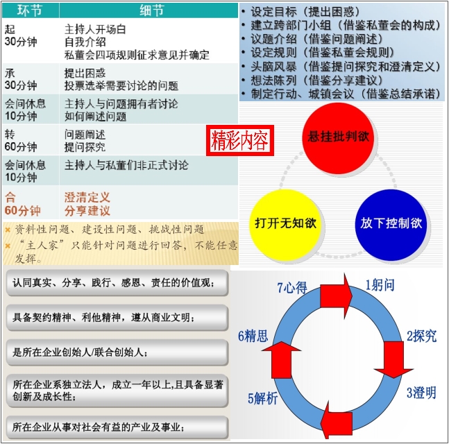 私董会 2021-09-18 私董会是一种新型的学习方法。私董会聚焦于一个真实问题,通过结构化的对话, 能够拓展参与者的思维边界,改变心智模式,共创群体智慧,寻找解决的方案。近几年私董会作为企业家群体学习的新模式得到广泛应用。本资料告诉(1)您什么是私董会,私董会的标准、价值以及经久不衰的核心秘笈、私董会解读、私董会与自媒体、私董教练的五项能力等;(2)私董会运营模式、落地详解、现场流程、工作手册等;(3)实例、战略发展规划、计划书等。