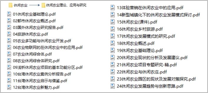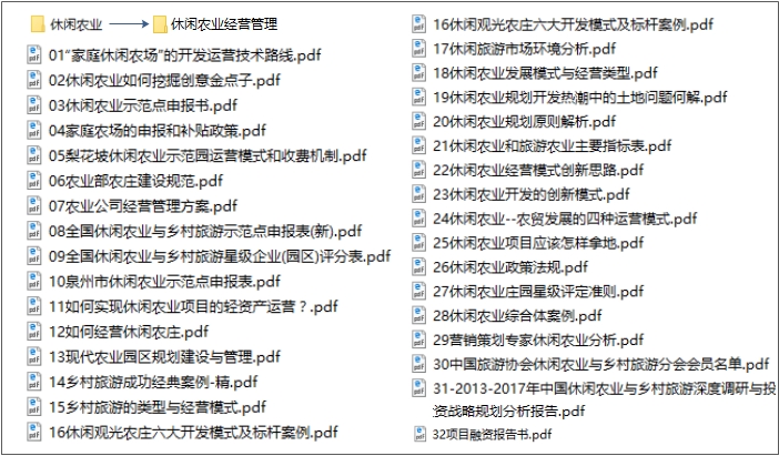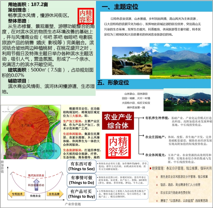 休闲农业是指在农村范围内 , 利用农业自然环境、 田园景观、 农业生产、农业经营、农业设施、 农耕文化、农家生活等旅游资源 , 通过科学规划和开发设计 , 为游客提供观光、 休闲、度假、体验、娱乐、健身等多项需求的旅游经营形态。 本资料包含如下内容:休闲农业理论、应用与研究(理论、应用、台湾欧美借鉴、多功能、综合体、研究趋势等)、经营管理(运营路线、模式、收费机制、案例分析、评定标准、示范点申报、资产运营、投资规划、融资报告)以及申报材料计划书建议书规划方案等内容。
