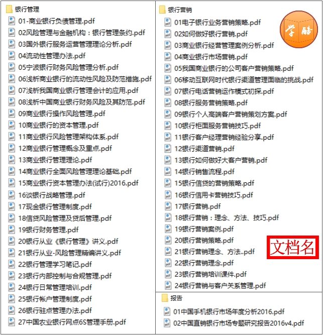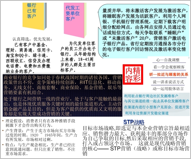 本系列资料包括(1)银行管理的各项培训内容:银行管理理论、战略管理、服务运营管理理论、负债管理、流动性管理、财务风险管理、操作风险管理、资本管理、内部控制与合规管理、账户管理、驻点管理办法以及6S管理手册等;(2)银行营销内容:银行营销理念、电子银行业务营销策略、商业银行经营管理案例分析、客户营销策略、银行电话营销运作模式、高端客户营销策划方案、银行柜面服务营销技巧、大客户营销、银行销售流程、信贷营销、信用卡营销、营销理念、方法、技巧与案例、客户关系等;(3)人力资源:包括某知名银行的人力资源战略规划、银行营业网点人力资源配置以及银行各部门工作职责;(4)市场活动:如校园活动方案、社区活动方案等;(5)报告:包括2016年手机银行和直销银行研究报告。