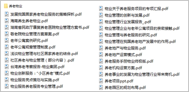 养老物业 2021-09-19 本系列资料包括:1)养老物业服务策略等;2)养老物业管理方案;3)养老物业管理;4)养老物业考察报告;5)养老物业项目专项报告;6)养老地产与物业;7)养老机构运营方案.8)养老园区的规划布局等。
