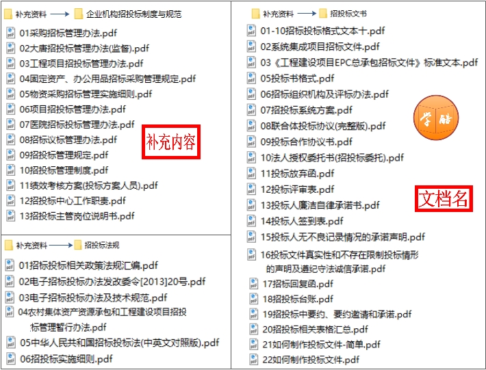 招标采购是指采购方作为招标方,事先提出采购的条件和要求,邀请众多企业参加投标,然后由采购方按照规定的程序和标准一次性的从中择优选择交易对象,并提出最有利条件的投标方签订协议等过程。整个过程要求公开、公正和择优。招标采购是政府采购最通用的方法之一,目前越来越多的企业按照政府采购模式采购,此外,通过了解政府采购对于参与政府采购项目也是企业获得公共服务的机会。本系列学习资料包括《招标采购合同管理》、《招标采购项目管理》、《招标采购专业实务》、《招标采购专业知识与法律法规》等内容构成,此外还提供27类型工程招标采购合同范例。