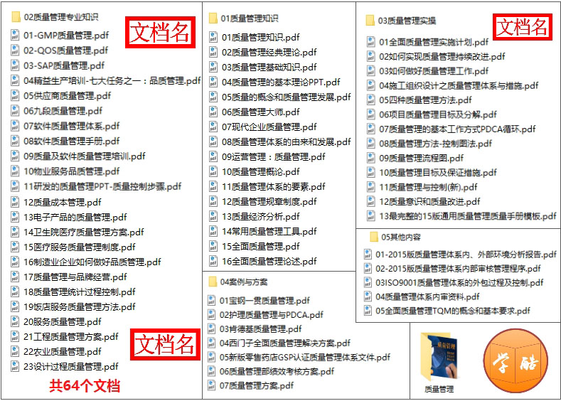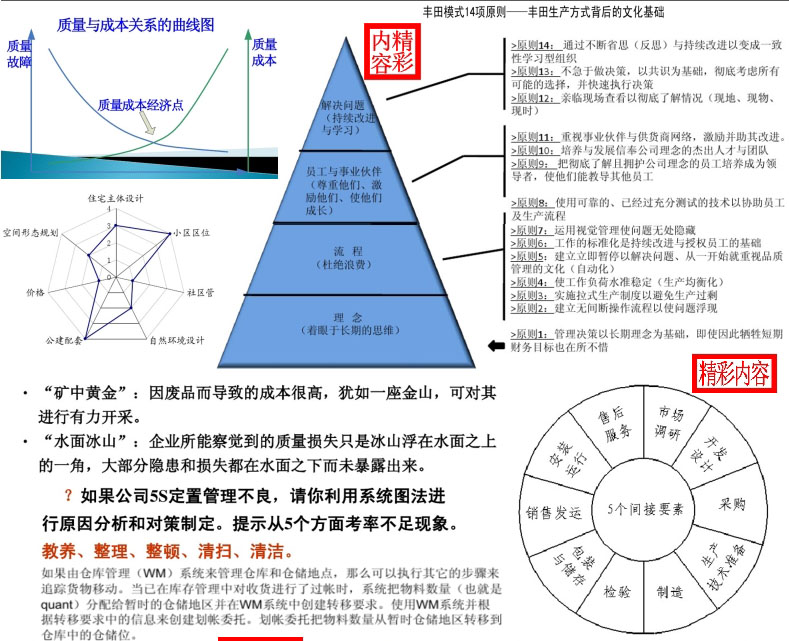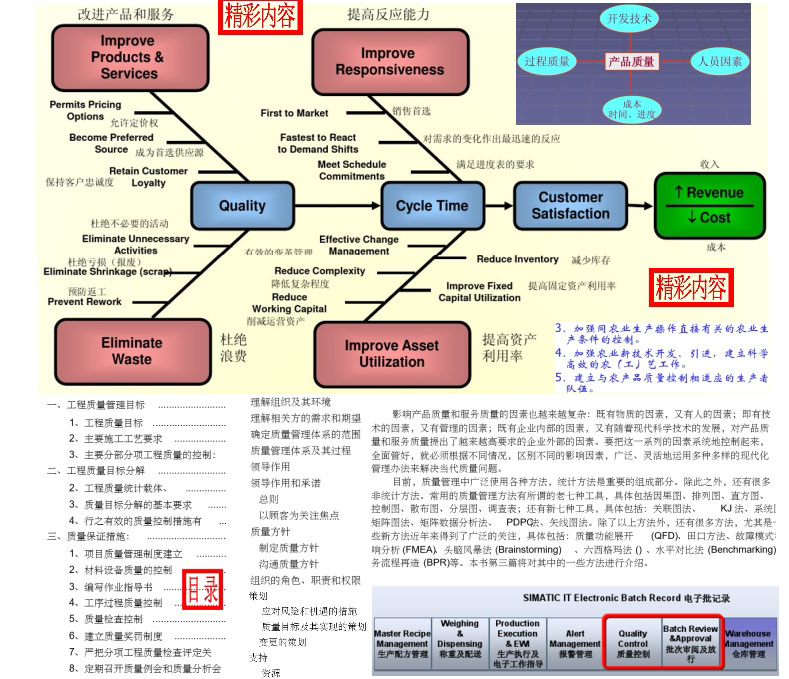 质量=不懈努力来尽可能好地满足用户的期望。报告显示质量优异排名前20%的企业的获利比一般公司高出30%,更是质量差的企业获利率的两倍左右。本系列资料包括质量管理知识(发展历史、经典理论、质量要素、管理工具、规章制度、品质管理、运营中的质量管理)、行业应用(GMP质量管理、QOS质量管理、SAP质量管理、卫生院医疗质量管理方案、制造业企业如何做好品质管理、饭店服务质量管理方法、服务质量管理、农业质量管理、工程质量管理、软件质量管理体系)、专业质量管理(设计过程质量管理、供应商质量管理、质量成本管理)、质量管理方法与实操(全面质量管理实施计划、何实现质量管理持续改进、施工组织设计之质量管理体系与措施、项目质量管理目标及分解、质量管理流程图与管理方法、质量意识和质量改进、质量管理体系内部审核管理程序等)、案例(肯德基质量管理、西门子质量管理)。