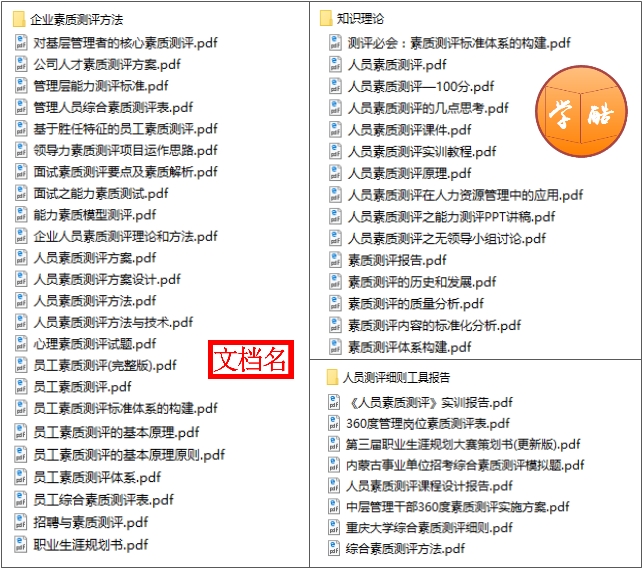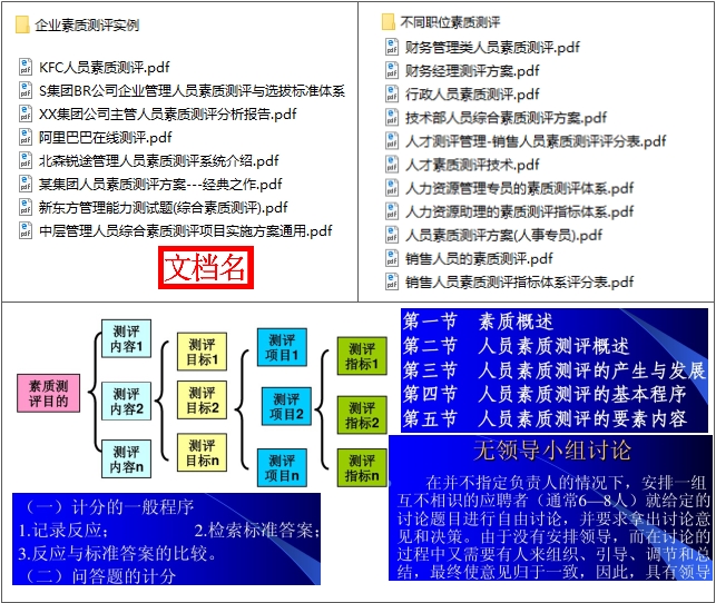 人员素质测评是企业招聘、人员选拔以及判断人力资源结构是否合理的重要的工具,本资料包括:(1)人员素质测评知识与理论,包括素质测评的历史发展与原理、素质测评体系构建、素质测评内容的标准化分析、素质测评报告等;(2)企业素质测评方法,包括员工素质测评的基本原理原则、人员素质测评方法与技术、领导力素质测评项目运作思路、职业生涯规划书、能力素质模型测评等;(3)工具报告;(4)企业素质测评实例,包括阿里巴巴、新东方、万科等知名企业案例或案例分析;(5)职位素质测评,包括财务人员、销售人员、行政人员、技术人员等职位的素质测评等。