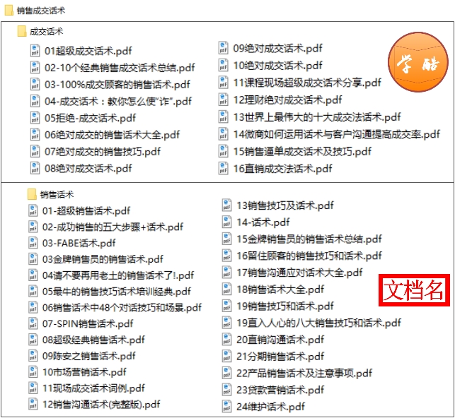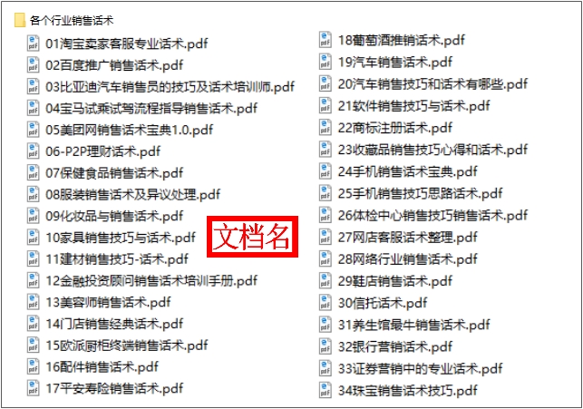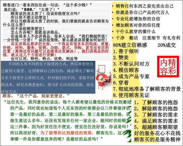 销售成交话术 2021-10-19 找对人,说对话,才有生意做。话术是销售很重要的战术,直接关系到成败。本系列资料包括:销售话术(经典话术、陈安之话术、金牌销售员的销售话术、销售技巧及话术、现场成交话术词例、留住顾客的销售技巧和话术、产品销售话术及注意事项等)、各个行业和知名企业销售话术(如百度话术、美团话术,淘宝卖家客服专业话术、网络销售话术、软件销售话术、手机销售话术、门店销售话术、汽车销售话术、收藏品话术、家具销售话术、美容销售话术、酒业销售话术等)以及绝对成交话术等内容。